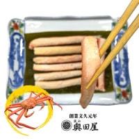 富山湾の紅ズワイガニブランド「高志の紅ガニ(こしのあかがに)」の棒肉身だけを身抜きし、奥田屋オリジナル”お刺身風仕立て”の製法で熟練の職人が手作りした贅沢な昆布締め。